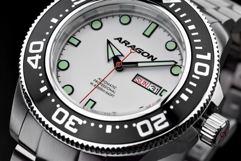 De ARAGON Divemaster Automatic 50mm A054WHT is een vrolijk en degelijk horloge. Onder de motorkap vindt u het automatische SII NH36 uurwerk, wat geproduceerd is door Seiko. Door de leuke kleur (de wijzerplaat geeft geheel licht in het donker.) en het design is het horloge ideaal voor de lente en zomer en voor alle activiteiten in het water. Het horloge is namelijk 200 meter waterdicht, wat ervoor zorgt dat u er goed mee kan zwemmen.