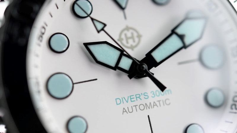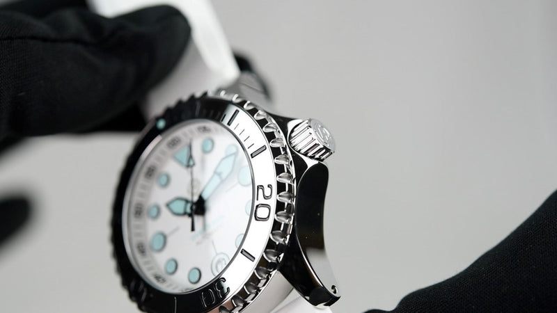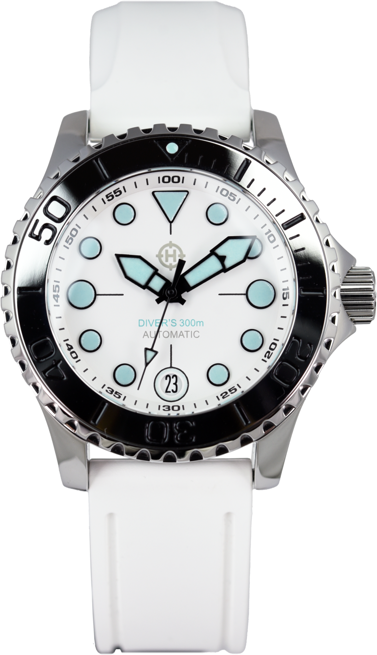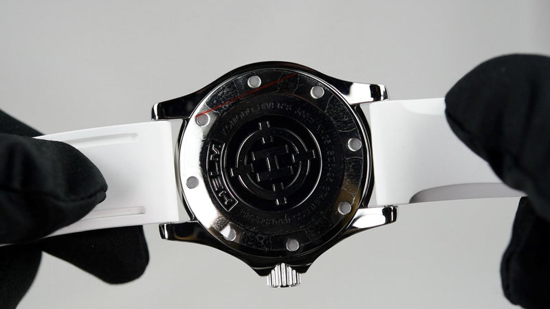 De Helm Komodo White Limited Edition (Pre-owned) is een gloednieuw horloge, met folies en wordt geleverd met de doos, garantie kaart (11-28-2023), een extra lunette en de stalen band nog in de folies.