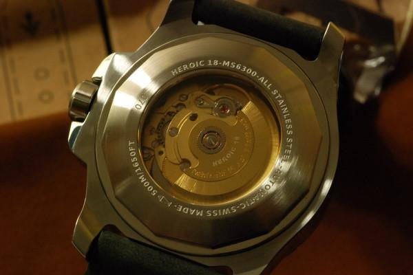 De HEROIC18 MS6200 is een prachtig Swiss Made horloge met onder de motorkap een betrouwbaar automatisch Zwitsers ETA2824-2 (28,800 bph) uurwerk, dat 'hackt' en met de hand opgewonden kan worden. De mooie blauwe sandwhich wijzerplaat wordt beschermd door prachtig gebold saffierglas met een AR (anti-reflection) coating.