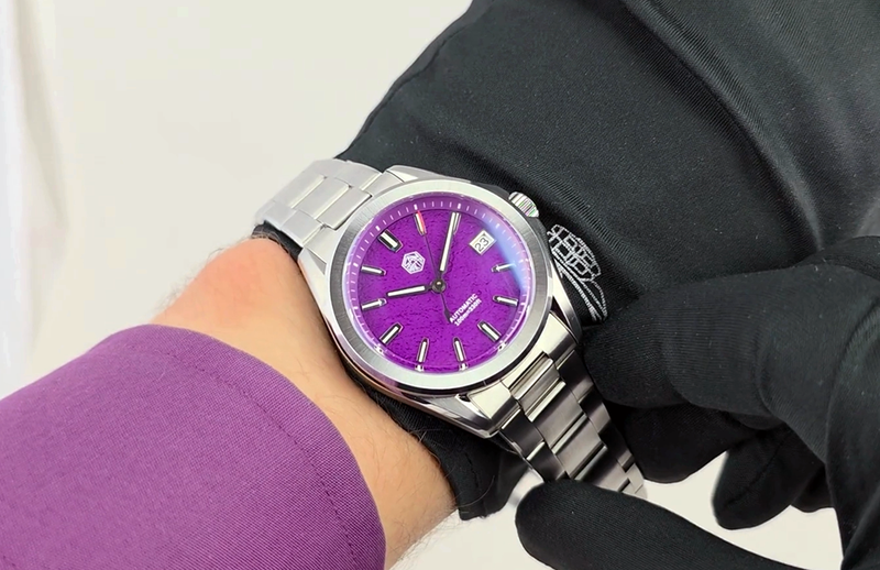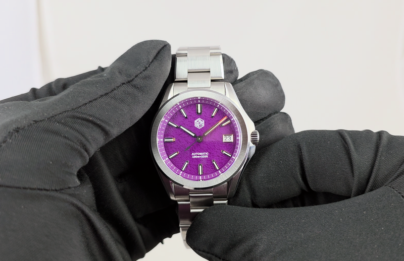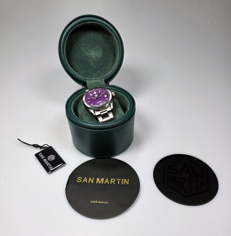 De San Martin SN0129G-C Purple (Pre-owned) is een horloge in goede staat en is nauwelijks gedragen en komt met de doos maar geen papieren.