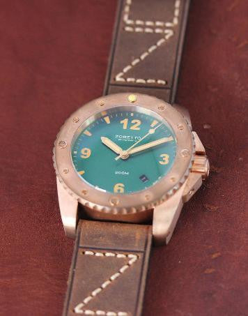 De Zoretto Indy Green Dial is een spectaculair horloge met onder de motorkap een betrouwbaar Japans Miyota 9015 (28,800 bph) uurwerk. Het uurwerk is ook zichtbaar door het kijkglas aan de achterkant van het horloge. De wijzerplaat wordt beschermd door gebold saffierglas met een AR coating. Wat er het meeste uitspringt bij het horloge is het materiaal: CuSn6 brons. Brons heeft de leuke eigenschap dat het gedurende het dragen steeds meer patina opbouwt. Dit is een geleidelijk proces wat ervoor zorgt dat elke horloge uniek is en blijft. Verkleuren is dus normaal! Wel is het met een Cape Cod doekje mogelijk om het horloge (grotendeels) terug te brengen naar de originele staat.