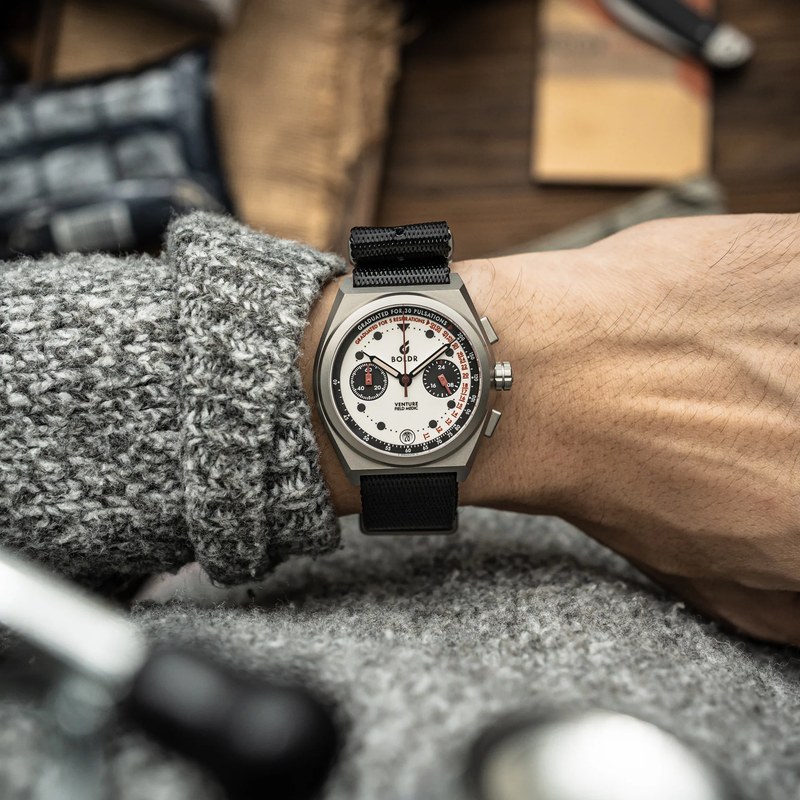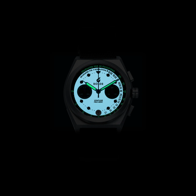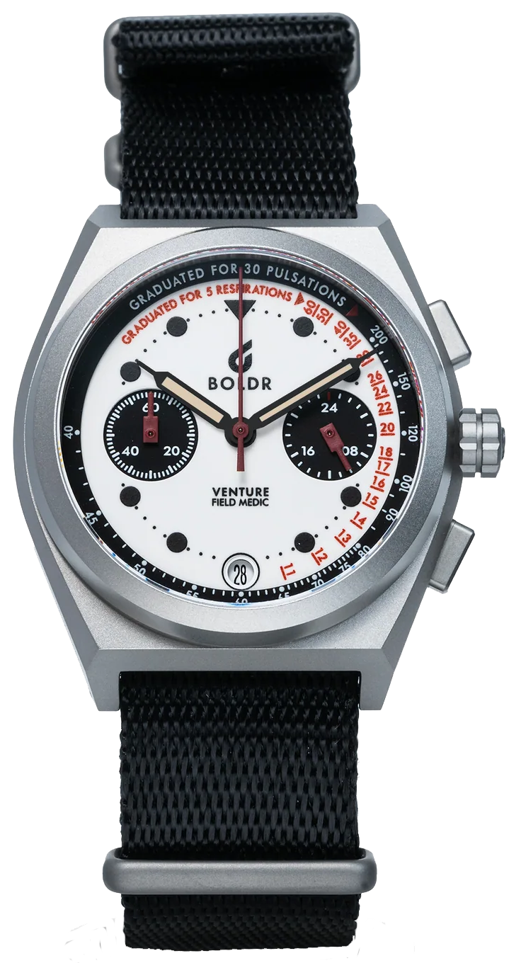 De BOLDR Venture Field Medic II is een fenomenaal, sportief horloge dat geschikt is voor ieder avontuur met behulp van hoog draag comfort. Het comfort komt door de ongelooflijke lichtgewicht titanium kast en canvas band. Het horloge heeft een Mecaquartz, Made in Japan SII VK64 uurwerk onder de motorkap, met een chronograaffunctie.