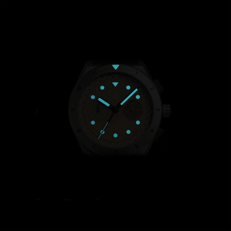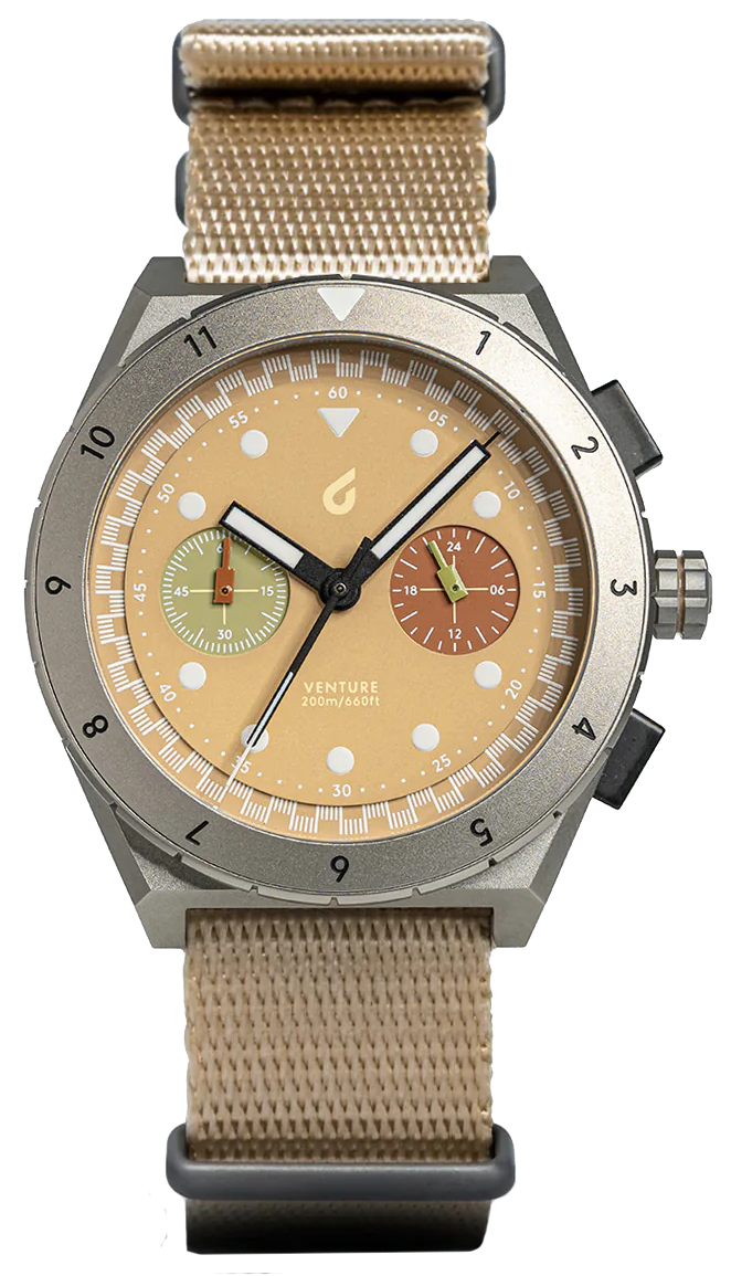 De BOLDR Venture Velo Khaki is een fenomenaal, sportief horloge dat geschikt is voor ieder avontuur met behulp van hoog draag comfort en dat met wielrennen in gedachten is ontworpen.. Het comfort komt door de ongelooflijke lichtgewicht titanium kast en canvas band. Het horloge heeft een Mecaquartz, Made in Japan SII VK64 uurwerk onder de motorkap, met een chronograaffunctie en een tachymeter op de wijzerplaat. De tachymeter kan worden gebruikt om de snelheid per uur over een vaste afstand te meten, of de afgelegde afstand over een bekende hoeveelheid tijd.