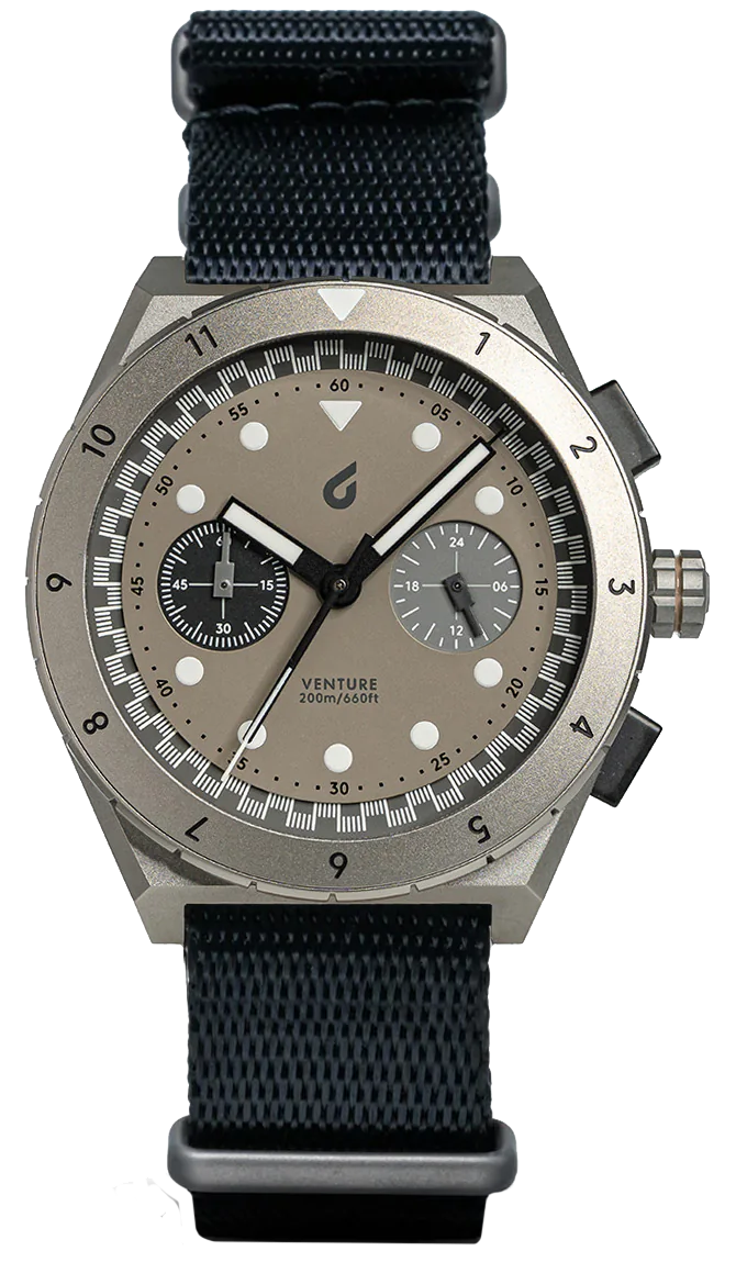 De BOLDR Venture Velo Mono is een fenomenaal, sportief horloge dat geschikt is voor ieder avontuur met behulp van hoog draag comfort en dat met wielrennen in gedachten is ontworpen.. Het comfort komt door de ongelooflijke lichtgewicht titanium kast en canvas band. Het horloge heeft een Mecaquartz, Made in Japan SII VK64 uurwerk onder de motorkap, met een chronograaffunctie en een tachymeter op de wijzerplaat. De tachymeter kan worden gebruikt om de snelheid per uur over een vaste afstand te meten, of de afgelegde afstand over een bekende hoeveelheid tijd.