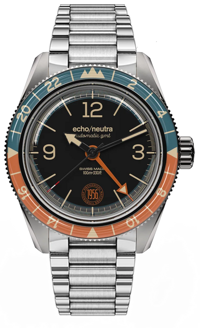 De Echo/Neutra 1956 GMT Black is een uitstekend, sportief horloge dat een uitgesproken vintage uitstraling heeft – alsof het afkomstig is van een merk met een geschiedenis van vele decennia.