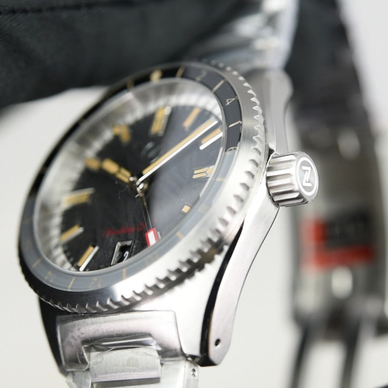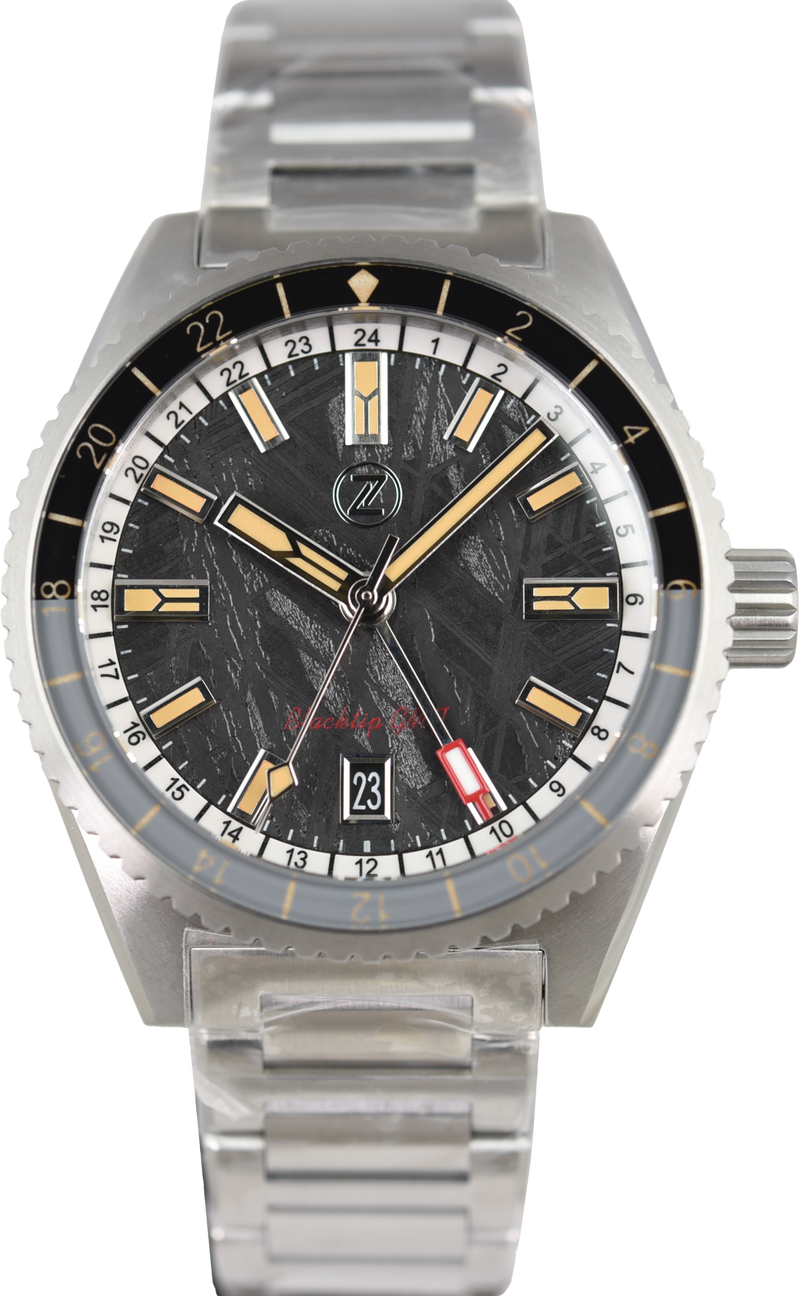 De Zelos Blacktip GMT Meteorite (Pre-owned) is een horloge in ongedragen staat, met tags en folies en komt met de volledige set met doos en papieren (3/2023).
