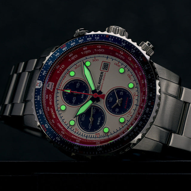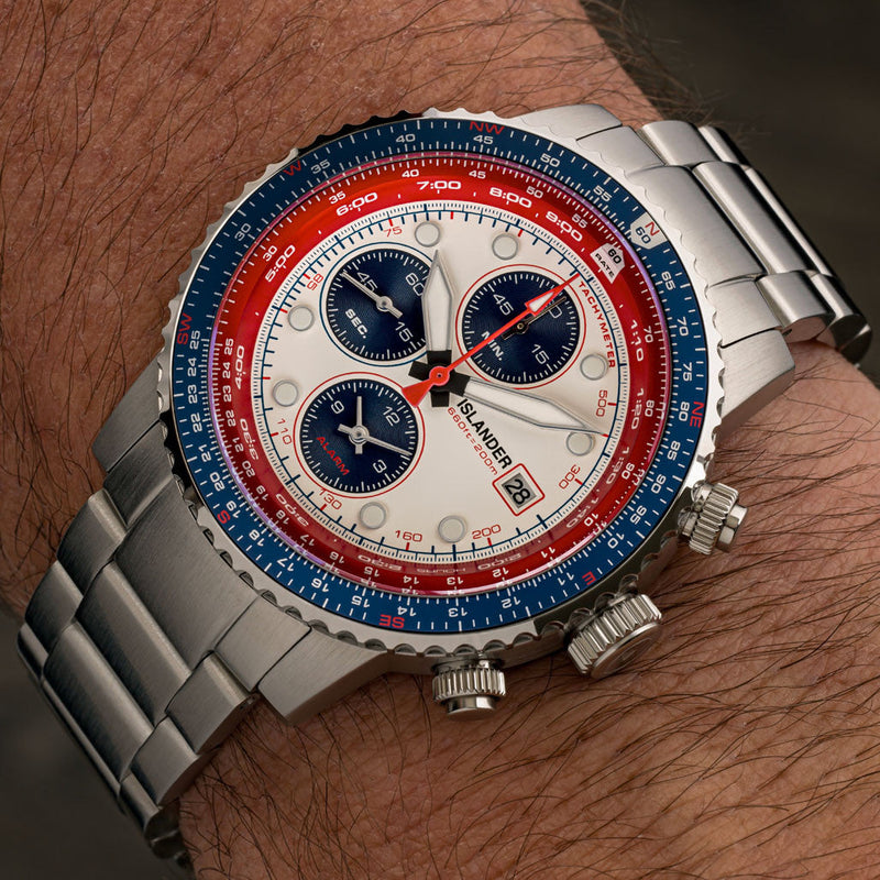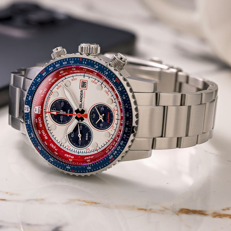 De Islander Watch Calverton Flight Chronograph Alarm White #ISL-324 doet misschien denken aan de iconische Seiko Flightmaster, en dat is geen toeval! Islander Watches wilde dit legendarische model nieuw leven inblazen, maar dan met een aantal moderne upgrades.