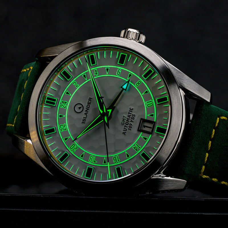 De Islander Watch Melville GMT White Golf Ball Hammer Dial #ISL-211 combineert schoonheid met functionaliteit – het beste van twee werelden! Om te beginnen met de schoonheid… kijk alleen al naar de wijzerplaat! De prachtige gehamerde wijzerplaat geeft extra diepte en zorgt voor een zeer dynamische uitstraling.