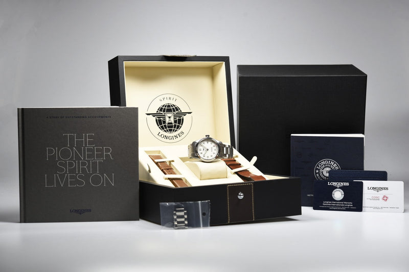 De Longines Spirit 42mm L3.811.4.73.6 (Pre-owned) is een horloge in prima staat met normale draagsporen en komt met de volledige set met doos en papieren (16/06/2022).
