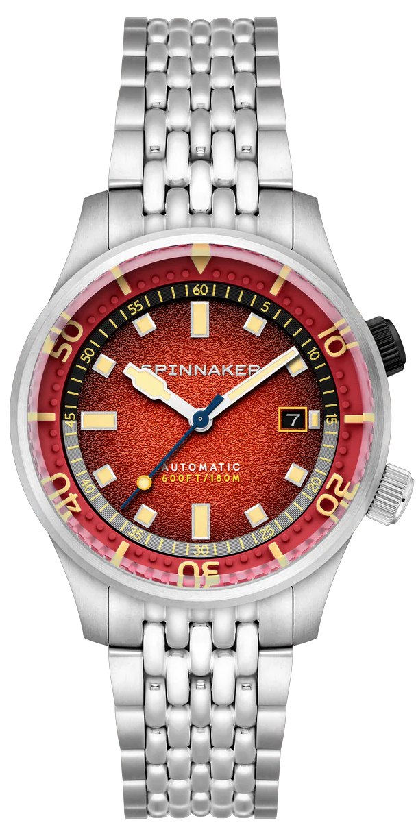 De Spinnaker Bradner Red Reef SP-5062-55 is een prachtig horloge met een compressor-stijl kast en een draaibare interne lunette. Onder motorkap treft u een betrouwbaar automatisch (mechanisch) Made in Japan SII NH35 uurwerk dat zichtbaar is door het glas in de achterdeksel van het horloge.
