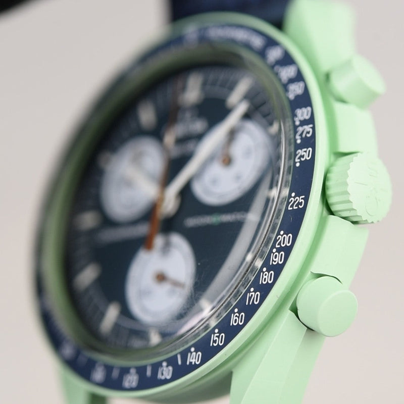 De Swatch Moonswatch Mission On Earth SO33G100 (Pre-owned) is een horloge prima staat met normale draagsporen en wordt geleverd met de volledige set met doos en papieren (20/7/2022).