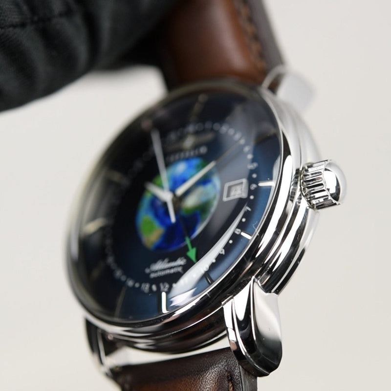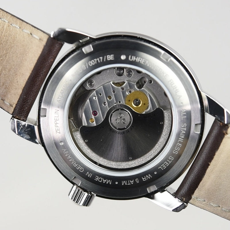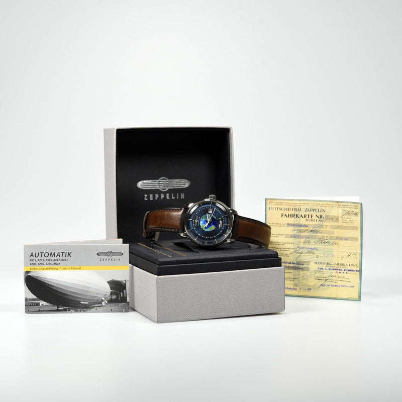 De Zeppelin Atlantic Automatic GMT 84683 (Pre-owned) is een horloge in goede staat met normale draagsporen en wordt geleverd met de doos en papieren (01/02/2025)
