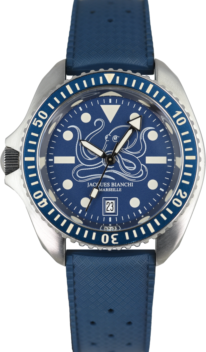 De Jacques Bianchi JB200 Poulpro Blue (Pre-owned) is een horloge in prima staat met normale draagsporen en komt met de volledige set met doos en papieren (05/01/2024).