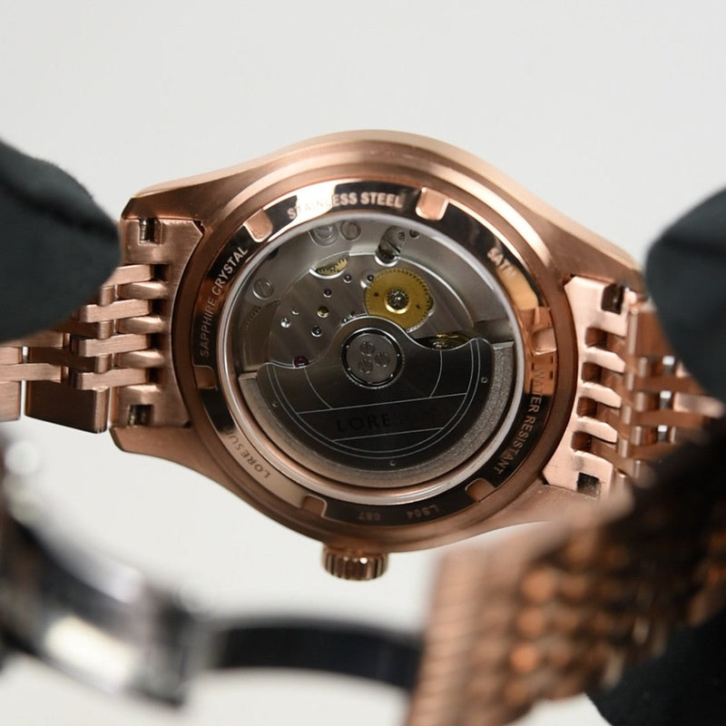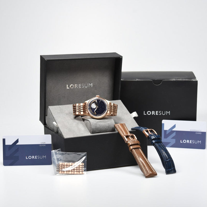 De Loresum LS04 Rose-gold (Pre-owned) is een horloge in goede staat en is nauwelijks gedragen en komt met de volledige set met doos en papieren (27/08/2024). Het horloge komt met de stalen band en 2 lederen banden.