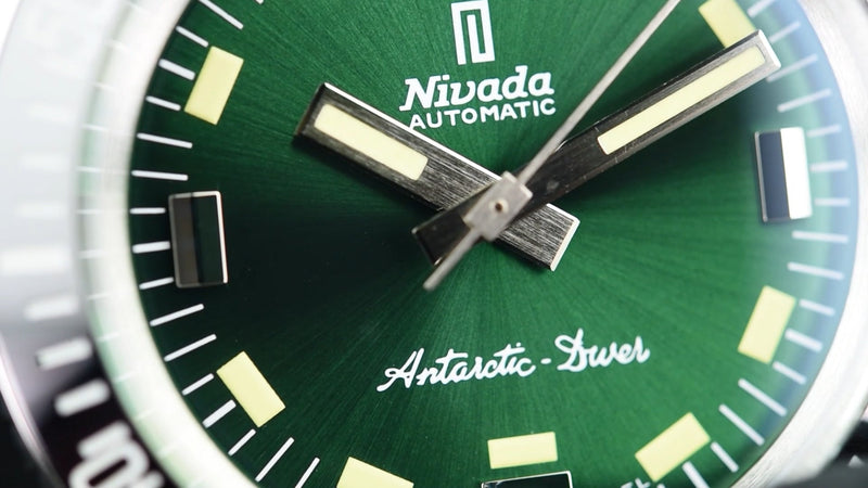De Nivada Grenchen Antarctic Diver Green Limited Edition (Pre-owned) is een horloge in goede staat en is nauwelijks gedragen en komt met de volledige set met doos en papieren (24/4/2025).