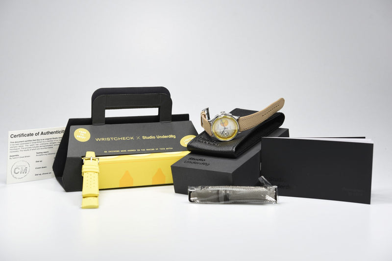 De Studio Underd0g x Wristcheck Uneggspected Fried Egg (Pre-owned) is een horloge in goede staat en is nauwelijks gedragen en wordt geleverd met doos, een extra Studio Underd0g milanese stalen band en garantiekaart (niet ingevuld).