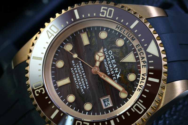 De OceanX Sharkmaster Bronze SMB544 Tiger Iron Limited Edition is een stoer horloge van hoge kwaliteit. Het design eert bekende horloges uit het heden en verleden, maar heeft duidelijke OceanX invloeden. Onder de motorkap vindt u een automatisch Miyota 8315 uurwerk. De wijzerplaat wordt beschermd door 4.1mm dik saffierglas (met een AR coating). De indrukkende waterdichtheid van 500 meter wordt mogelijk gemaakt door een heliumventiel dat u aan de zijkant van de kast kan zien. De 120-kliks lunette is van zwarte keramiek (ceramic, wat ook heel hard en krasbestendig is) en het horloge is voorzien van een comfortabele rubberen band met bronzen gesp. Al deze kwaliteiten zorgen ervoor dat het horloge vrijwel elke situatie aan kan!